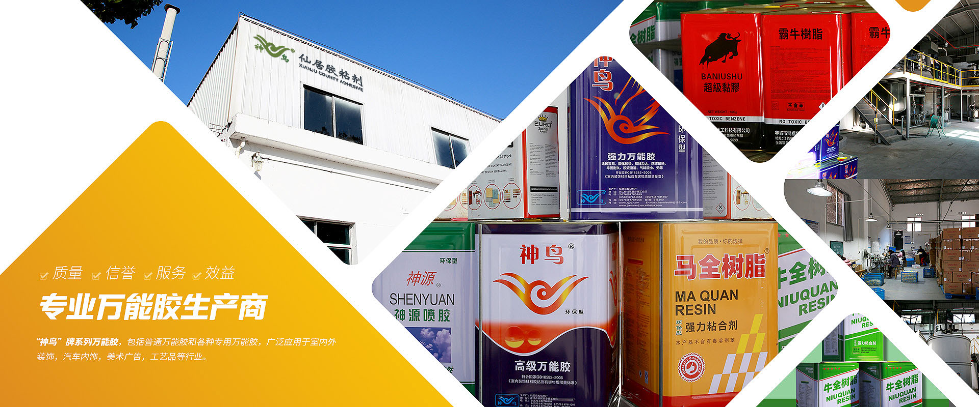 仙居县胶粘剂厂生产的“神鸟”牌系列万能胶,包括普通万能胶和各种专用万能胶,广泛应用于室内外装饰,汽车内饰,美术广告,工艺品等行业。
